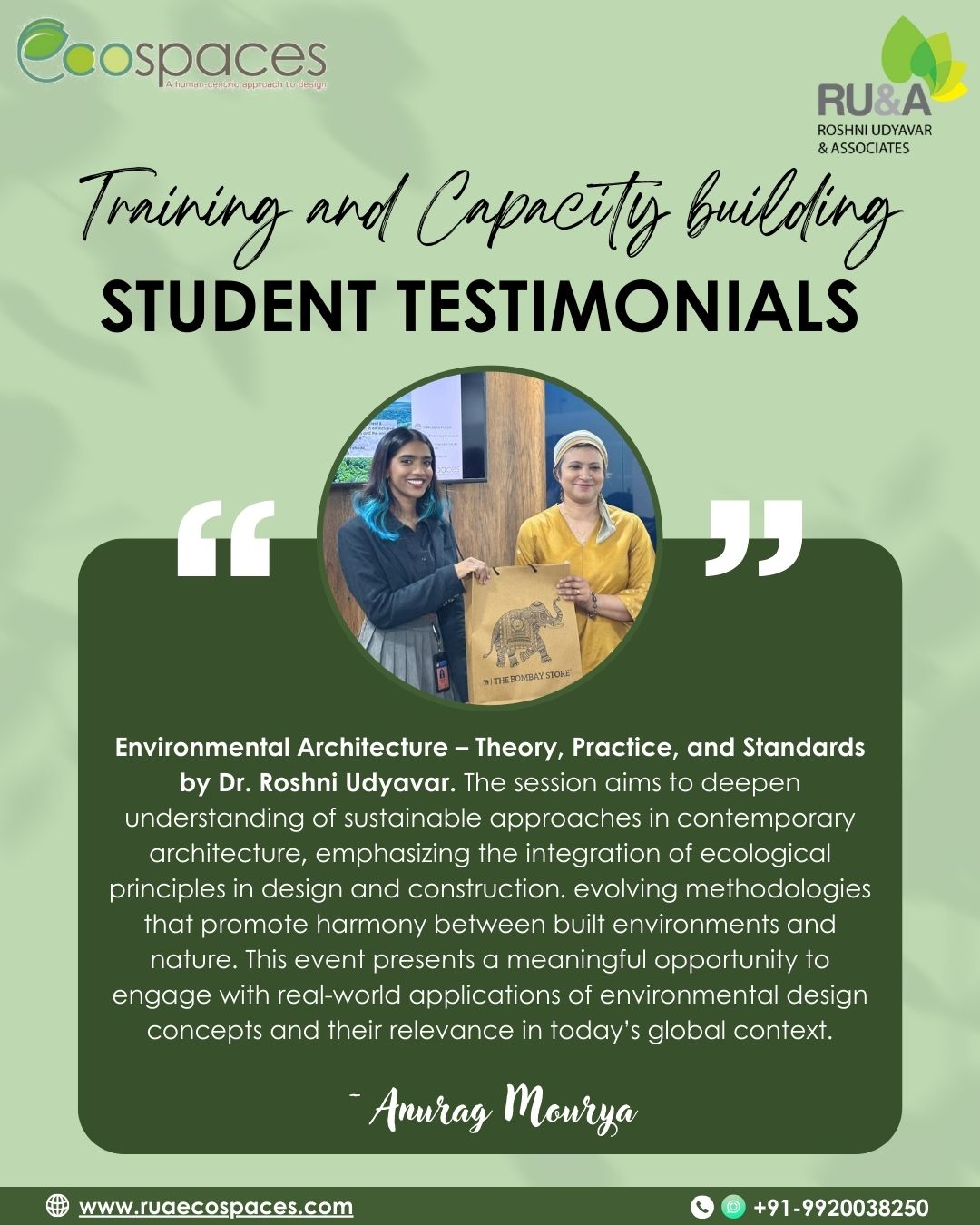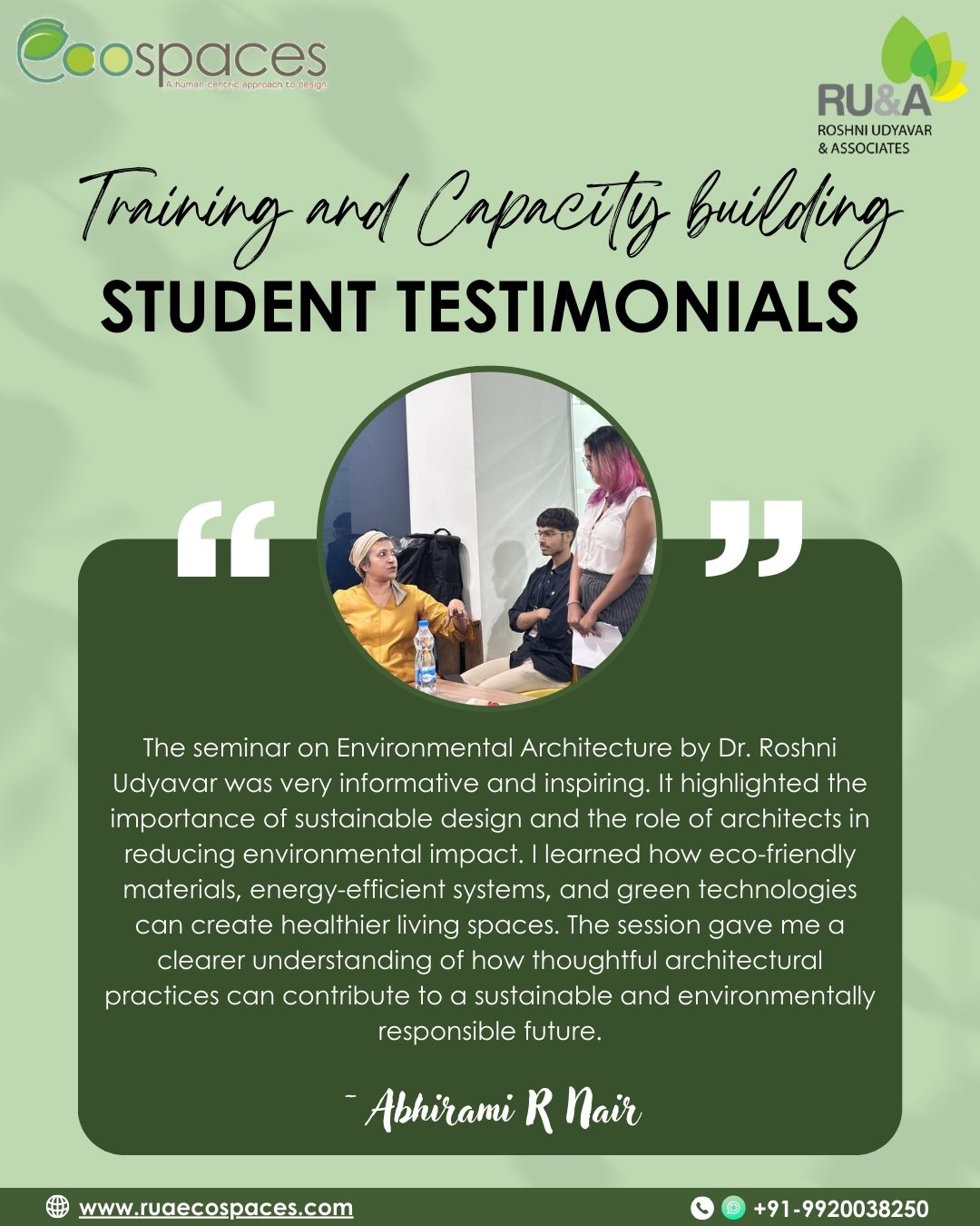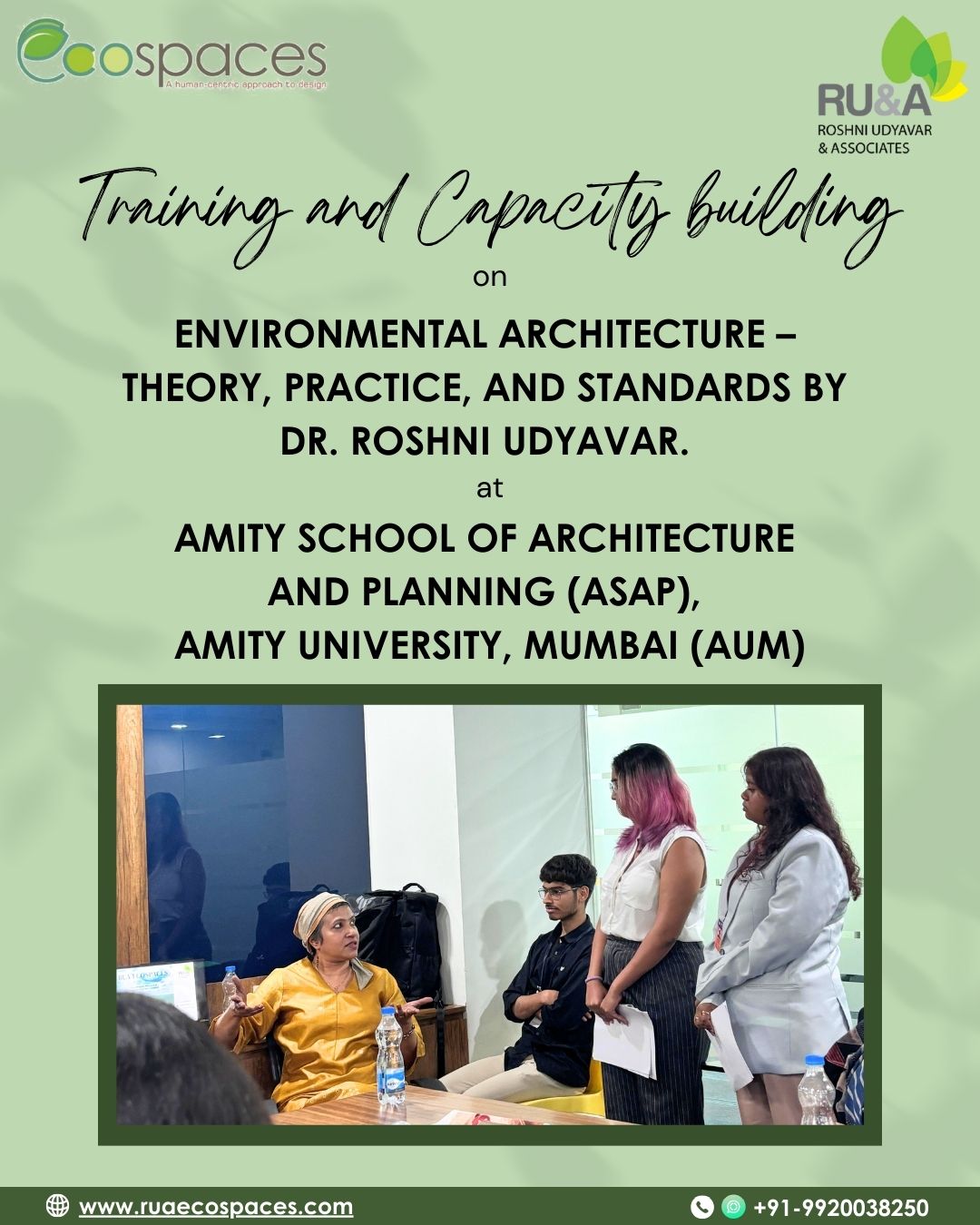 We’re delighted to share heartfelt reflections from students of Amity School of Architecture and Planning @asapmumbai , Mumbai, who attended the session on “Environmental Architecture – Theory, Practice & Standards” conducted by Dr. Roshni Udyavar Yehuda, CEO of RUA Ecospaces on 3rd November, 2025 held at its city campus in Kurla..