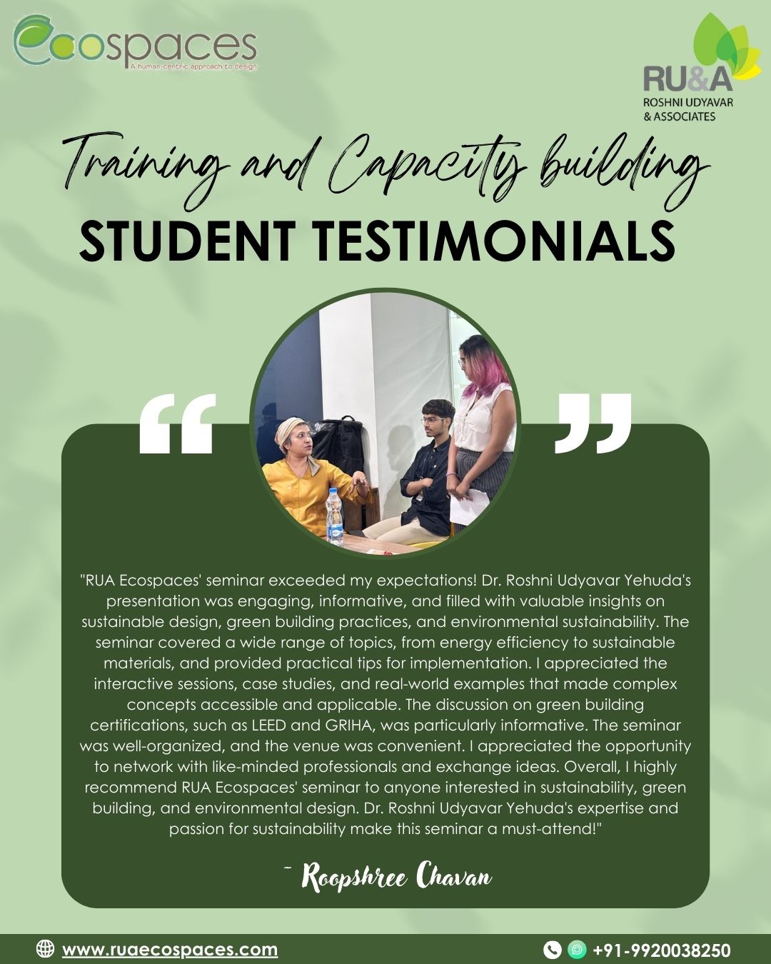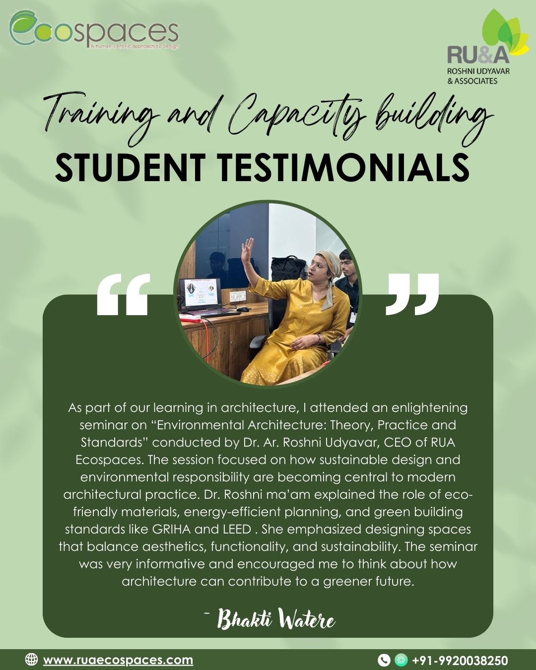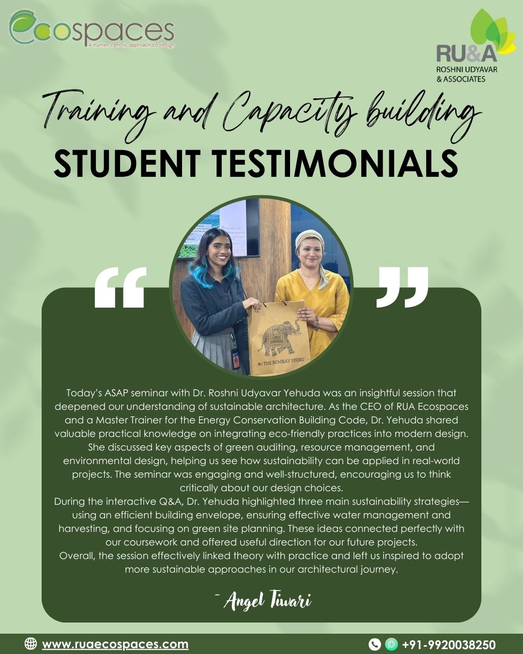 We’re delighted to share heartfelt reflections from students of Amity School of Architecture and Planning @asapmumbai , Mumbai, who attended the session on “Environmental Architecture – Theory, Practice & Standards” conducted by Dr. Roshni Udyavar Yehuda, CEO of RUA Ecospaces on 3rd November, 2025 held at its city campus in Kurla..