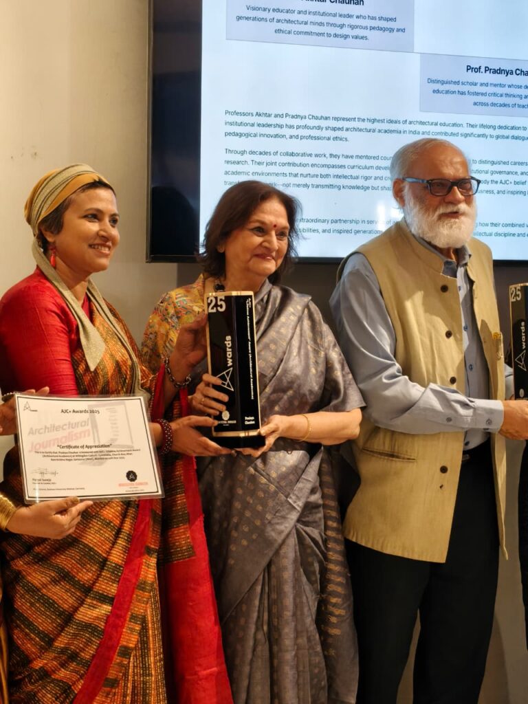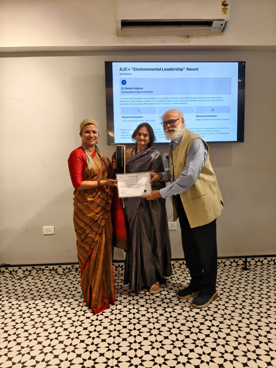 Presented by Prof. Akhtar and Prof. Pradnya Chauhan, this recognition celebrates Dr. Roshni’s pioneering contributions to energy-efficient design, sustainable architecture, and environmental education -achievements that continue to inspire architects and researchers across India and beyond.